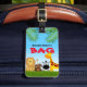 Personalized childrens bag tag featuring a safari jungle theme including a lion, giraffe, monkey and zebra.