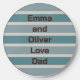 There are lines of display text you can change to the names of the dad's children to create a custom message. (Shown: Emma and Oliver Love Dad) The text is brown. The stripes are shades of blue.
