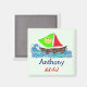 Kids personalized artwork magnet. A happy sailboat drawing on a square magnet with two lines of text to customize with a boys or girls name and any text you choose, such as "drew this", "made this", "colored this", etc. Templates make it easy to personalize.
