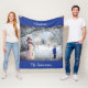 A Child's Snowman Christmas Blanket designed with a winter snow scene with a young child staring at a Snowman on a blue background. The text includes: Mr. Snowman and a Name. To personalize, simply insert your child's first name into our easy template, replacing the sample. T's fast and easy, and makes a great Christmas gift.