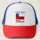 Trucker hat features the Chilean Flag with the word CHILE underneath, in the colors of the flag. Above, a place for your name in blue letters for a cool look or a special, personalized gift. Trucker hat looks great at a family reunion.