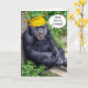 Chimpanzee leaning on a rock and wearing a gold graduation cap for humorous graduate congratulations.