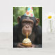 A cute chimpanzee, wearing a colorful paper party hat is celebrating with a delicious birthday cupcake in a vibrant green forest.