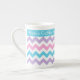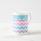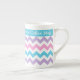A stylish Bone China Coffee Mug for you to personalize, with a pattern of Turquoise Blue, Candy Pink, Light Purple and White chevrons. If you prefer the mug without any text, you can easily customize it by deleting the text and moving the chevron pattern upwards until the plain turquoise band disappears.