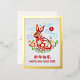 “Happy New Year” red faux foil typography in both Chinese and English and a stunning visual of a graphic multi color and real gold foil cut paper rabbit with flowers, clouds and stars, overlay a traditional light gray circle pattern and real gold foil border on the front. On the back are a multi color cut paper cloud and star visual, your personalized note, and return address. Feel the warmth and joy of the holiday season whenever you send this stylish yet modern, personalized 2023 Chinese New Year of the Rabbit real gold foil vertical postcard. Make sure someone special receives this greeting!