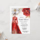 A beautiful watercolor graphic of a Chinese bride wearing a red and gold cheongsam bridal gown with decorative floral detail has her dark hair swept up into a bun on top of her head that has a pretty band around it. She is wearing long dangling faux diamond earrings and is framed by a single large white and red flower. Black calligraphy script and roman style black templates appear to her right for your custom wording. This design is ideal for elegant; simple; floral or botanical red and gold bridal showers. Feel free to change the background and font color to any color of your choice to suit your special occasion.