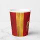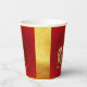 Simple golden Tiger paper-cut into a decorated circle with Chinese lantern and Fu ideogram (meaning Luck), blossoms and Chinese greeting into small circles under the tiger + "Year of the Tiger" in hand writing style + Fu ideograms as background. Design on party paper cup for Chinese New Year of the Tiger 2022.