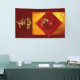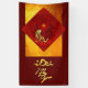 Simple golden Tiger paper-cut into a decorated circle with Chinese lantern and golden Fu ideogram (meaning Luck), blossoms and Chinese greeting into small circles under the tiger + "Year of the Tiger" in handwritting style + Fu ideograms as background onto a golden textured paper (image printed). Design on vertical banner with dark red background for Chinese New Year of the Tiger 2022.