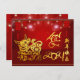 Chinese lanterns with fireworks as background with golden paper-cut of an cute ox + large golden 2021, golden Year of the Ox, greeting "Happy New Year" in Chinese and yellow Ox ideogram. Design on horizontal basic postcard with dark red background + same background in back. Matching greeting card, holiday postcard, invitation, craft supplies, party supplies and more... Perfect for a joyful Chinese New Year of the Ox 2021.