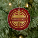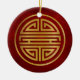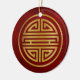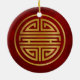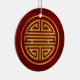 Both sides of this ceramic ornament feature a Chinese shou character which represents longevity. The symbol is colored in gold on a textured red background.