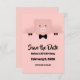 Save the date flat card for a 2019 Chinese New Years party with a pink background and faded hearts. A big pink pig wearing a formal bow tie. Ready to celebrate the year of the pig 2019.