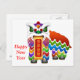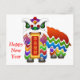 Happy Chinese New Year Lion Dance with Traditional Colorful Costume Outfit Holding a Banner or Scroll Wishing All Great Fortune, Wealth and Prosperity Festive Illustration and Drawing Postcard