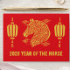 It says "2026 YEAR OF THE HORSE" on the front. The inside has a faux bushed gold pattern. The back flap has a golden cloud, with the text "Happy New Year" underneath, and a template for you to type your name. If you don't want to include the name, you can delete it. This design has templates for easily filling out text, but you can also customize further if you want.