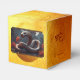 Chinese Snake into a landscape of Chinese traditional houses and gardens (model n°1) with golden background and small borders that you can remove, such as the "wood" image, which corresponds to the element linked to the Snake of 2025. Design on cube favor box with small customizable texts : greeting in Chinese + "Happy Chinese New Year" + "Year of the Snake" + 2025 + message to customize and Family name.