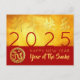 Modern design with golden textured paper (printed image) with Large golden Chinese wishes + large 2025 in red + small Snake paper cut-out with yellow texts HAPPY NEW YEAR and Year of the Snake onto a red background. Design on horizontal holiday postcard. You can easily change year by clicking the customize button. Matching greeting card, sticker and more soon... Perfect for a timeless and modern Chinese New Year of the Snake 2025.
