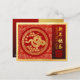 An elegant visual of a golden snake with blossoms into a circle (inspired by traditional Chinese paper-cut) with red circle overlay a red and yellow traditional Asian pattern + graphic "HAPPY NEW YEAR" in Chinese and English and old Chinese calligraphy for "snake" on the right on gradiant red color band. On the back are the same gradiant background (on the left) for texts to personalize: your message and return address + golden textured paper (image printed) on the right. Design on horizontal holiday postcard. You can easily personalize this Lunar New Year postcard by customizing the greeting on the back or delete for your handwritten note, type in your return address. Matching real foil holiday postcard.