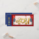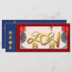 Chinese pattern in blue tone on both opposite sides with red lanterns, pale pink Chinese ideograms as background, large golden 2021 + two small Ox golden paper-cut (image printed) + wishes in Chinese and English. Design on rectangular flat card with large ox and other message with Family name to customize in back of the card. Matching greeting card, postcard and other flat cards.