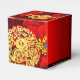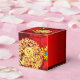 Design of Chinese peonies + golden Rabbit paper-cut circle (image printed) + Large red peony + Happy New Year in Chinese and English + customizable 2023 + Family Name and message to customize onto a red background with auspicious clouds. Design on cube favor box. Perfect for Chinese New Year of the Rabbit 2023.