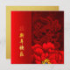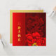 Design of stylized red Chinese peony + red Rabbit paper-cut (image printed) with radishes + Happy New Year in Chinese and English + customizable 2023 onto a decorated red background with auspicious clouds. Design on square flat card invitation. Matching square red envelope and sticker. Perfect for Chinese New Year of the Rabbit 2023.
