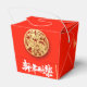 Large wishes "Happy New Year" in Chinese (white modern calligraphy) and in English, Tiger round golden paper-cut (image printed - model n°1). Design on Take-out favor box with red background + Family name and message to customize. You can easily change text (font, color, size and position) and background color by clicking the customize button. Available in other style: gable, tent and cube boxes and with other tiger paper-cuts.