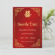 An artistic gold double happiness symbol and a golden frame on a shimmering red floral background. Save the date text in an elegant script. Matching Chinese wedding products available.