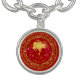 This beautiful charm bracelet design specifically for the year of the ox, (those born in 1913, 1925, 1937, 1949, 1961, 1973, 1985, 1997, 2009, 2021), is created in traditional red and gold and features a gold foil ox on a colorful fireworks background adorned with the Chinese character for 'year of the ox" and an elegant geometric border. Makes a unique New Year's or birthday gift. Search ID542 to see other zodiac symbols and additional products with this design.