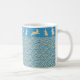 Colorful mug featuring Chinese Zodiac animal: the rabbit. Golden rabbits on a blue background. With golden waves. Digital art.