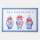 This chic door mat features 3 different ginger jars with red bows. The border around the card is a blue border. You can personalize with your name.