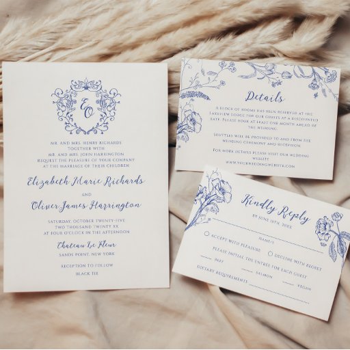 Introducing the perfect way to announce your upcoming nuptials with our double-sided wedding save the date card! This card features a stunning vintage chinoiserie inspired monogram wedding crest in the color blue on the front with a whimsical botanical design complete with butterflies.