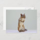 Photo of a chipmunk standing up on its hind legs with its front paws close to its chest. You can see the chippie's striped back and fluffy tail. The background of the photo is white. This is a closeup chipmunk picture that can be easily customized and printed on many different photo products.
