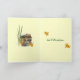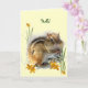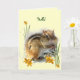 This friendship card features a cute little chipmunk who is stuffing his chubby cheeks as fast as he can on a spring day. He has a black and white stripe down his back, white around the eyes, golden brown fur, and a pink nose. The sweet little critter is surrounded by green grass and yellow lilies. He also appears inside the card along with more lilies. The text can be customized to suit your needs.