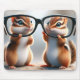 Two adorable chipmunks are playfully holding up a pair of oversized glasses