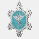 Design features metallic-look chiropractic emblem on a light turquoise faux glitter look background.