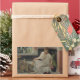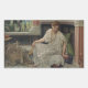 This design features a painting by the English artist Sir Edward John Poynter (1836–1919), who served as President of the Royal Academy of Arts. It depicts a beautiful woman named Chloe who is seated in an elegant portico surrounded by ancient-Roman architecture. She is holding a pair of woodwind musical instruments, like flutes, in one of her hands, and she is holding cherries in the other hand to tempt a small bird that is perched nearby. Chloe is wearing a long flowing toga-like dress and she has green sandals on her bare feet. She has neat brunette hair and she is wearing a colorful necklace. The architecture that surrounds her is painted in all kinds of beautiful colors. There are some tall flowers, including foxgloves and poppies, growing in the garden outside. The coast and the sea can be seen in the distance. The original artwork was painted by Edward Poynter in 1893.