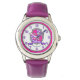 Chloe name meaning heraldry princess knights shield style kids wrist watch. Knights style shield monogram letter C art name simple numbered clock face perfect for in shades of purple, hot pink, white and grey. Personalize with your own name and name meaning for a great unique personalized gift, this example is for names with the letter C and currently reads Chloe Blooming goddess. Other matching items and names available. Unique shield drawing, graphic art, name research, wording and design by Sarah Trett. www.sarahtrett.com for www.mylittleeden.com
