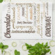 A chocolate lover's kitchen towel design sports a word cloud of chocolate, dark chocolate, almonds in English, German and French plus other words in a variety of font styles, sizes and colors. This design is also available in the place mats and napkins.