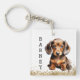 Super cute chocolate brown tan dachshund sausage dog puppy key ring for dog lovers, pet sitters, pet care, pet adoption, pet hotels, dog walkers, dog groomers, dog trainers, doggy daycare and veterinarians. Customize with your own dog's name. Replace or keep sample dog pic.