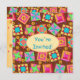 Invite a quilter or quilt lover with this colorful fully customizable quilt square invitation. Fully customize on the front and back to add your own words, names and other information. This original quilt art makes a vibrant invitation. Quilt art based on original art features favorite patchwork quilt blocks plus unique blocks in vibrant and dynamic colors of orange, yellow, pink, turquoise, and lime green on a chocolate brown background for a beautiful color palette. A sunny yellow oval is on the front of the card to say "You're Invited" or other words of your choice. Show your love of quilting with these quilt art designs with other quilt art products. Quilt art is original art from fabric and quilt designer Phyllis Dobbs and is in a fabric collection from Quilting Treasures. This art is available on other products and in several color backgrounds. More products are available in Phyllis' BusinesswithFlair store. Match with coordinating stamps, envelopes, stickers and return address labels.