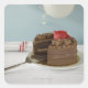 Chocolate cake with missing slice on table, square sticker