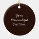 Round chocolate chip cookie ornaments that you can personalize for friends, family or clients... The design depicts an illustration of a delicious chocolate chip cookie over a dark rich brown background. Place your own custom text on the back side of this personalized cookie ornament , and even change the background colors and font styles. These ceramic template ornaments make for great personalized Christmas gifts during the holiday, or for any occasion where you need a custom cookie ornament! Category: personalized Christmas ornaments. Colors: milk chocolate and dark chocolate brown.