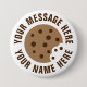 Chocolate chip cookie pin buttons with custom text. Personalized with your name or quote. Modern round design. Cute cookie logo with bite taken out and crumbs. Great for Birthday, baking event and more.