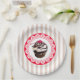 Chocolate Cupcake with Cherry birthday party Paper Plates with tan and white stripes and red whimsical lacey accents.