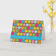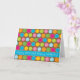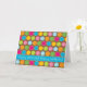 This birthday card design features colorful dots with contrasting outlines on a chocolate brown background. Blue stripe across lower card features funky text that says "Happy Birthday! Happy Birthday!"