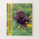 Jigsaw puzzles are family fun. Enjoy this 16" x 20", 56 oversized piece puzzle adorned with a close-up photograph of a chocolate Labrador Retriever lying in a California Poppy patch. Fill in the template fields with your words. Photo ©Patricia AZ Phillips