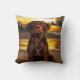 A chocolate Labrador Retriever sits on a sandy beach, gazing intently at the camera. The dog's fur is a rich brown, contrasting with the golden hues of the setting sun. The sky is ablaze with vibrant orange and pink clouds, reflecting in the wet sand. The ocean waves gently lap at the shore, creating a tranquil and serene atmosphere. Ideal gift for labrador lovers.