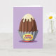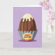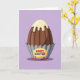 Designed with a sweet, romantic touch, the image centers on an egg-shaped chocolate treat set against a smooth lavender background. The chocolate is a deep brown with neat vertical ridges, giving it a gently dressed-up look, like it’s ready for a shared spring date 🌷. A thick white glaze pours over the top and drips down in rounded trails, like frosting slowly sliding during a cozy moment. The treat sits in a pleated silvery-gray wrapper that catches light like foil, adding a little shine and polish. On the front is a scalloped golden-yellow label that feels like a friendly note tucked onto a gift 🐇. The label carries a seasonal message in strong red and deep purple letters, centered and easy to spot against the yellow. A soft shadow sits just beneath the wrapper, and the glaze edges look slightly rounded where they meet the ridged chocolate.