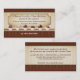 This business card for a chocolatier, chocolate factory or retail shop elegantly displays the fruits of a chocolatier's labor by featuring a row of delicious-looking homemade chocolates displayed on a counter. A business name, description and address is highlighted in a plaque on top of a cream striped patterned background. Add a phone number or a website under the counter against the damask pattern. The reverse reveals additional contact information and a tagline or description against the same striped wallpaper bordered by the chocolate brown diamond border on top and the damask pattern below. Available with matching products.