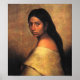 Portrait of a young Choctaw woman her body turned to the left, her head turned back to the front, and her gaze directed toward the viewer. She wears a pair of earrings and an off-the-shoulder garment made of animal skin. Her long dark hair is parted in the middle and falls down over her back, Oil on canvas, 30 x 25 in. Painted by P. Romer