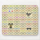 A pattern of rows and rows of eyeglass frames on a light yellow background. Colorful, or silly -- Which one to choose? This playful design pokes a little fun at the process of choosing frames. I created it from images of eyeglass frames I collected from various places on the internet. I arranged them in rows and then added a light yellow background for a retro mood.