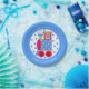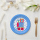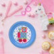 Colorful baby shower paper plate, done in blue, with a blue and white polka dot center and a red, blue, green, and yellow choo choo train engine, in the middle. Personalize the white arched text to suit your needs. Matching invitations and paper napkins are available.